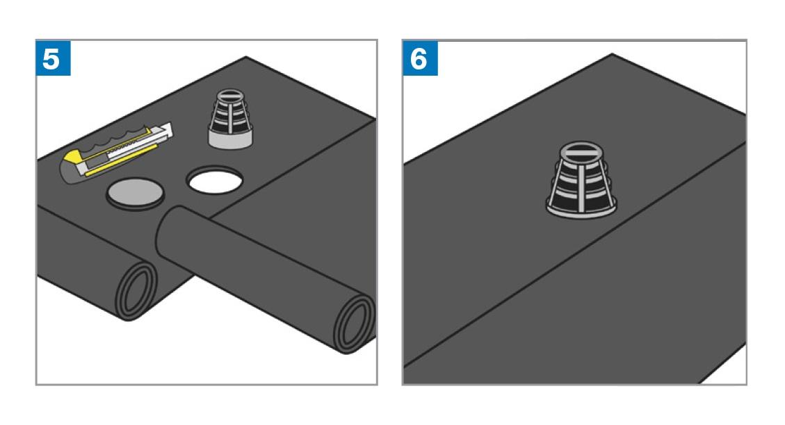 Adherir a fuego la pieza preformada de desagüe de acuerdo con el diámetro de la bajante(3). Colocar a continuación una pieza de refuerzo superior de medida que sobrepase en 10 cm el refuerzo inferior (4).